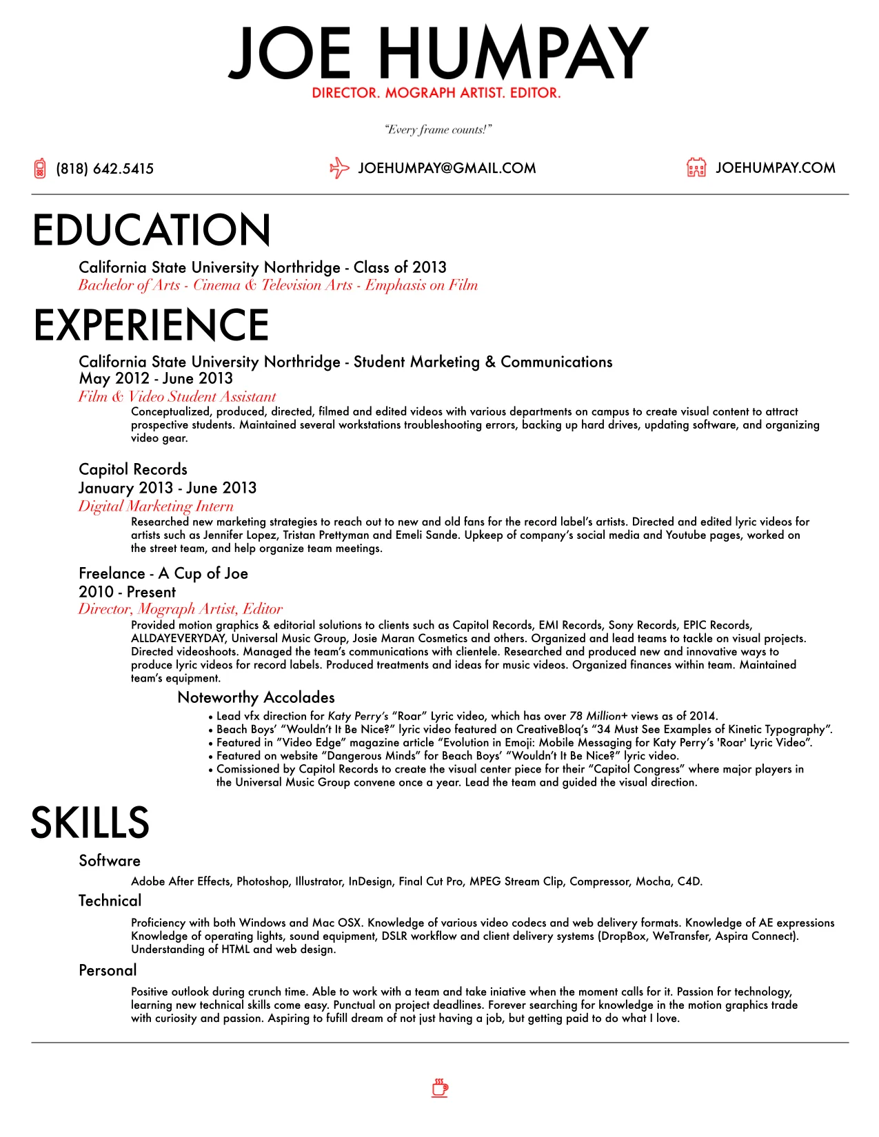 I'm Joe Humpay, a film school graduate from California State University Northridge. I currently reside in sunny Los Angeles, California. I am a freelance motion graphics artist and editor who has been working independently since 2010.